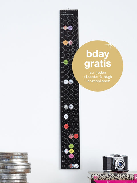 Our popular adhesive annual planners bring structure to your everyday life, functioning as project planners, family calendars, and shared apartment planners—but not just any old one. You'll receive a dot-on wall calendar of your choice and over 600 adhesive dots in matching colors. Simply assign colors (e.g., family, work, vacation), label, and stick on—done! We also offerweekly planners , birthday calendars,to-do pads , habit trackers , BUJO planners , and the special "dot on life" life planner , where you can mark each week of your life as a dot.